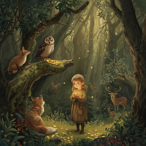 Was hat ein kleines Mädchen ganz allein im tiefen Wald verloren? Warum verschenkt es alle seine Sachen? Diese Fragen stellen sich die aufmerksamen Waldtiere, die ein einsames, kleines Mädchen beobachten. Weil die Kleine so verloren wirkt, wissen sie nur einen Rat: auf mit ihr zur großen Eule, die weiß immer, was zu tun ist, vielleicht auch diesmal.